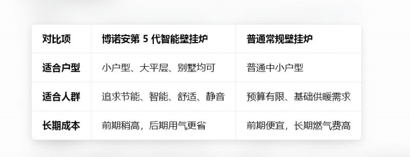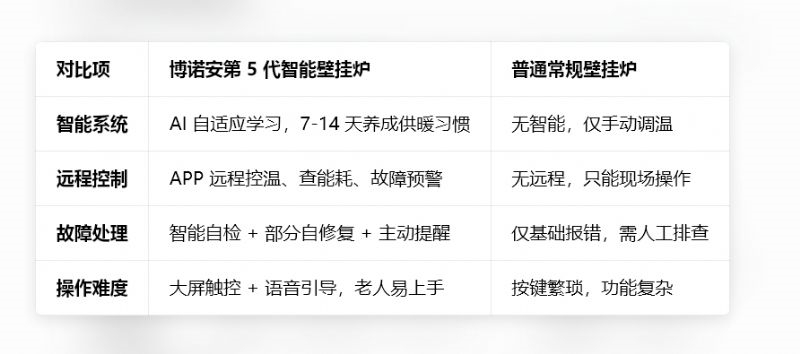 博诺安第 5 代智能壁挂炉 vs 传统壁挂炉 对比表